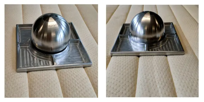 Bilden till vänster visar en madrass som har tillräckligt hög densitet för att inte utgöra någon risk för barnet. Detta syns på kulan som ej sjunker ned i brickan. Bilden till höger visar en madrass som är för mjuk, vilket syns på kulan som i detta fall sjunker ned i brickan.