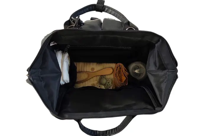 Denna skötväska är en stor och praktisk skötväska i ryggsäcksmodell för extra bekvämlighet. Med vid öppning med stålram, är innehållet i väskan alltid lättåtkomlig.